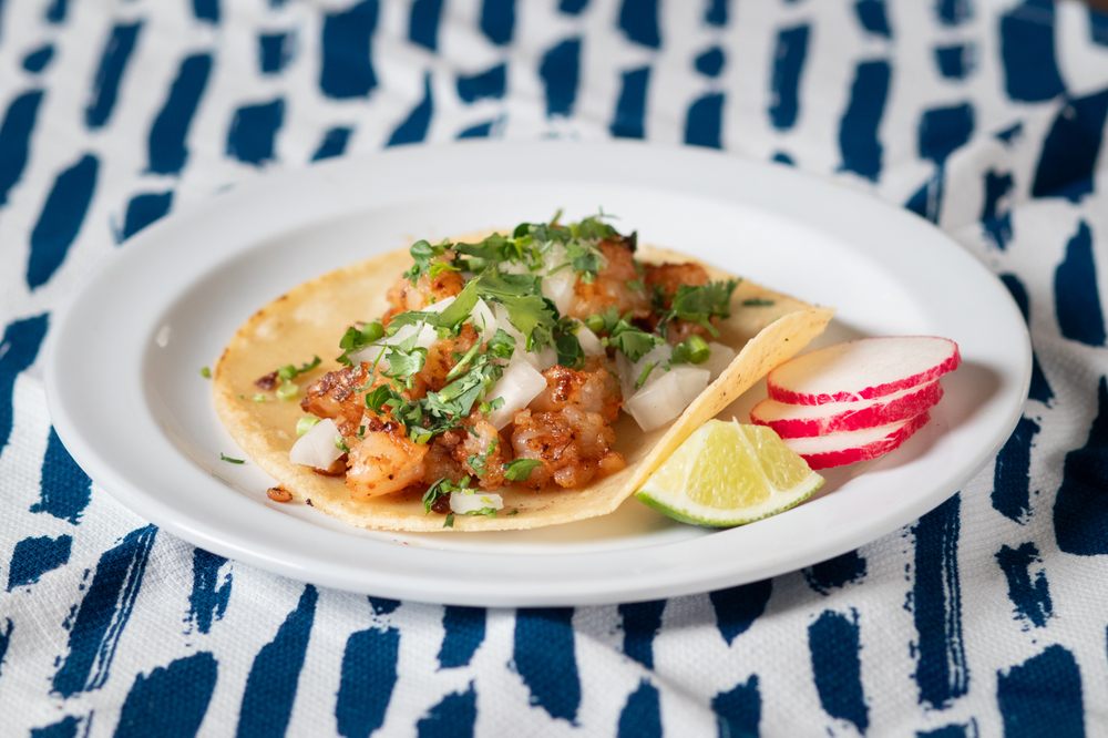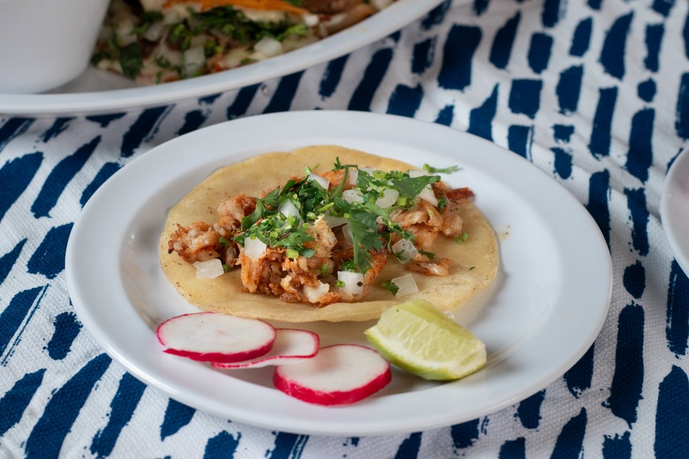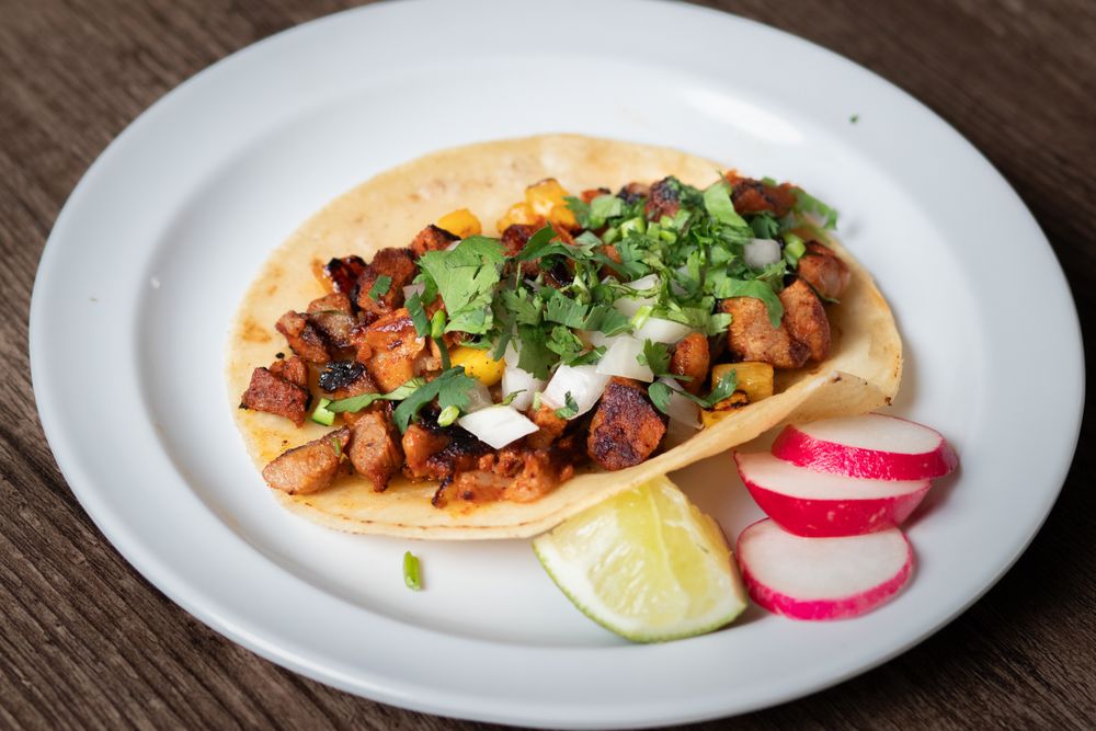 Traditionally this taco comes with diced pineapples. Our tacos come with diced onion and cilantro, unless told otherwise. Our corn tortillas are made by hand daily. You can substitute for flour tortilla, which are not made by hand.