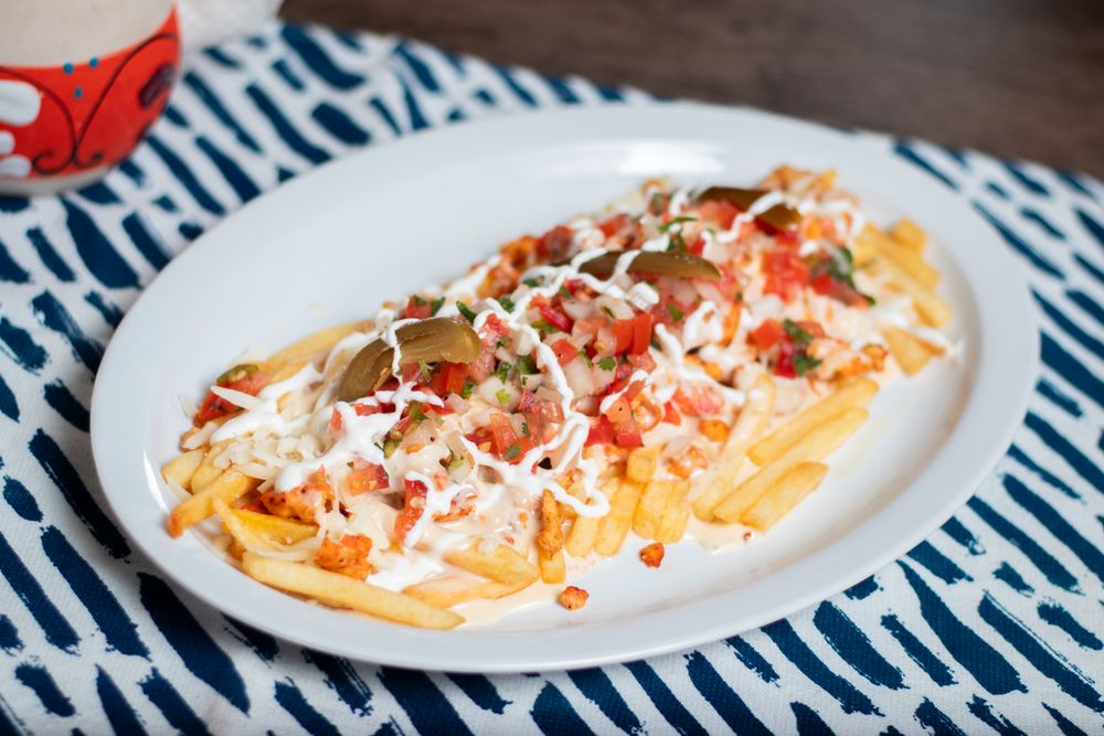 w/ meat (steak, chicken, or pork), fries, cheese dip, pico & jalapeno