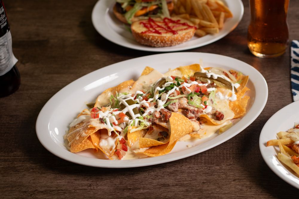 w/ meat (steak, chicken or pork), tortilla chips, shredded cheese, cheese dip, pico & jalapenos